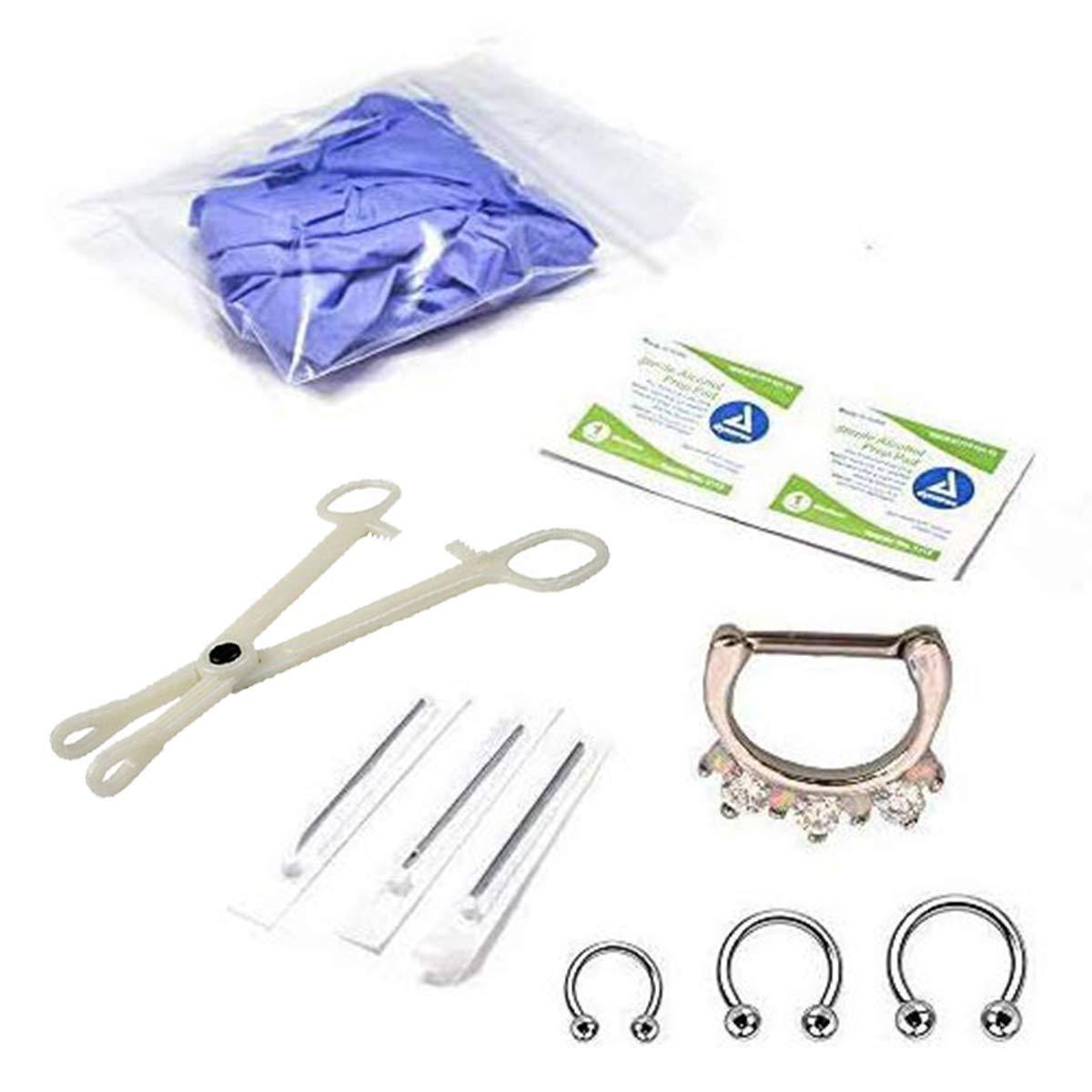 - 12PCS Piercing Kit includes: (3Pcs) Circular Barbell; (1Pc) 16G Septum Clicker; (3Pcs) Needles Are 100% Sterilized using ethylene oxide (EO) gas; (1Pc) Limited Edition Forceps Clamps, (2Pcs) AlcoholPad, (2Pcs) Pair of Latex Gloves - Large