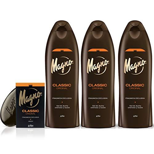 3 Bottles of Magno Classic Shower Gel 18.3oz/550ml with Magno Soap 4.4oz.