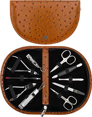 - CASE: Fashion leather ostrich brown, size ca. 28,5 x 14,0 x 2,5 cm. Our organizers are made of high-grade fashion or classic materials. Additional equipment: Microfiber cleaning cloth for cleaning steel items, general info sheet Finger - Nail Grooming.