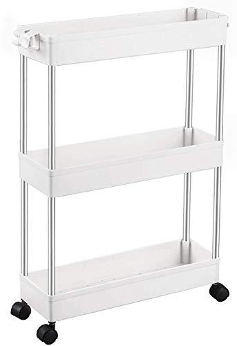 Flexible 3 Tier Storage Cart- The 3-tier slim storage cart is 5.1 in design which can be used in tight spaces in your home for storage. Suitable for closets, kitchens, bathrooms, garages, laundry rooms, offices or in-between your washer and dryer.Movable Storage Solution ; Side Hoop- 4 easy-glide, durable wheels make the storage cart smooth and convenient to pull in and out from narrow spaces. And 4 side hoops provide more spaces for you storageEasy To Install- The shelving unit organizer made form plastic and stainless steel, durable and stable.Quick and easy snap together assembly, easy care.Long Lasting Durability- The plastic surface blends with office decor and helps resist chipping or scratching while the mesh design gives it a contemporary appearance. Suitable for offices, mailrooms, cubicles, classrooms, dorm rooms and libraries.2 or 3 Shelves Adjustable- The rolling storage cart can be adjusted to 2 or 3 shelves for bathroom and kitchen countertops without the casters, so wide range of applications
