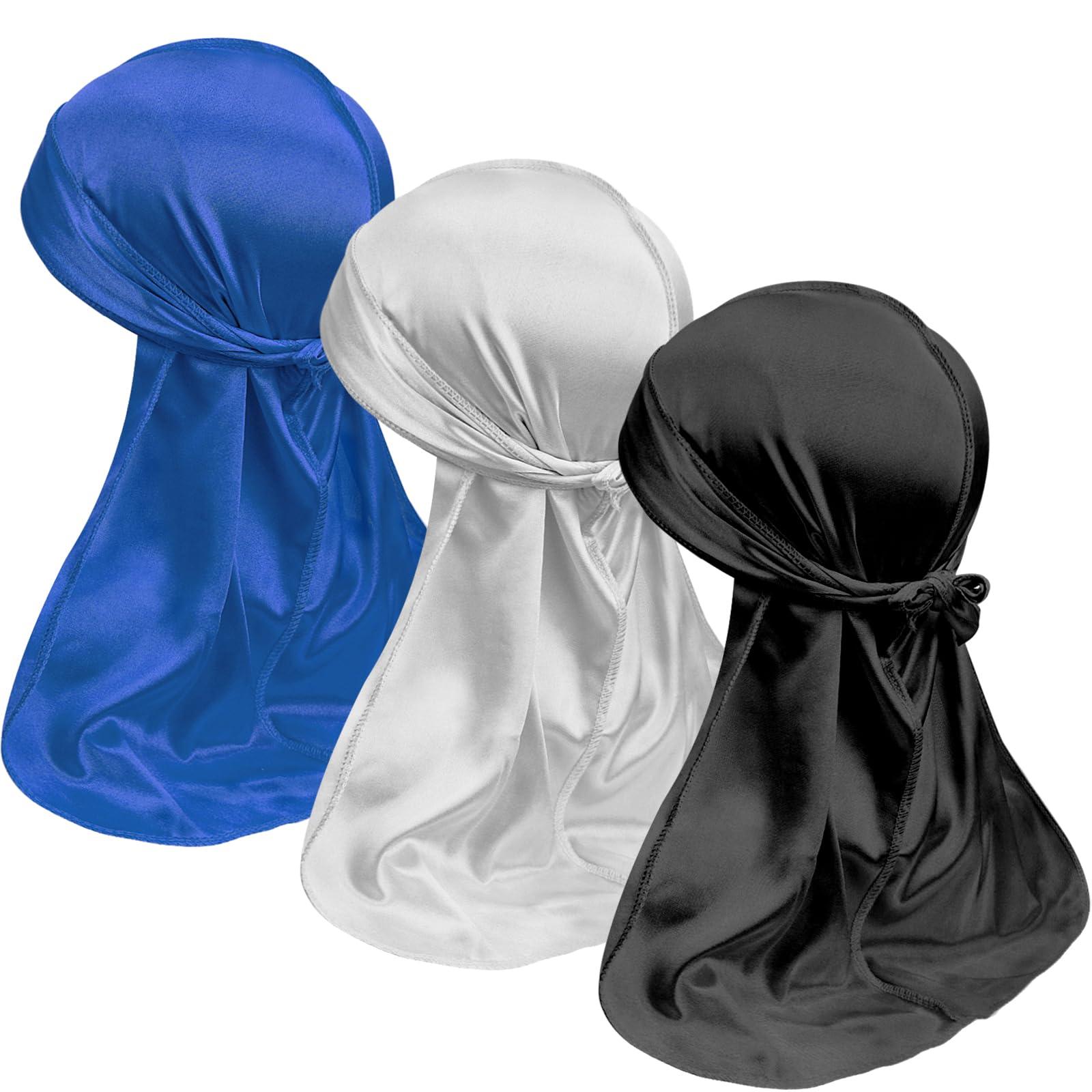 3PCS Silky Durags and 1 Wave Cap Packs for Men Waves, Doo Rag Compression Caps for 360 540 720 Waves (blue,white,black)