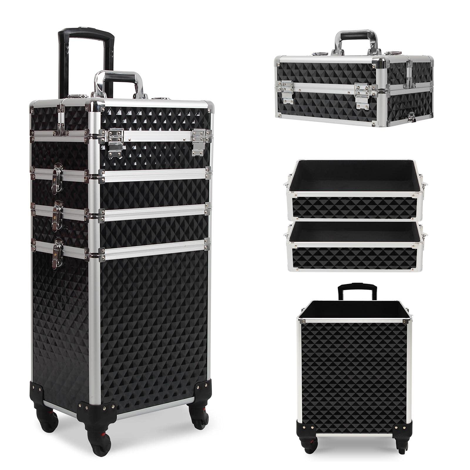 3 in 1 Makeup Case Aluminum Cosmetic Case Rolling Train Case Professional Makeup Train Case Large Capacity Trolley Makeup Travel Case Beauty Storage with Folding Trays and Large Compartments