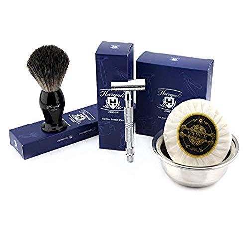 BLACK BADGER HAIR::Particularly suitable for wet shavers who like to treat themselves to a light facial massage. The brush head is made by machine, while the material is slightly firmer than other badger hair qualities - and varies in color from brownish - grey to black.Double Edge Safety Light Weight Stainless Steel Handle 3 Piece Safety Razor The razor uses a 3-piece design using some of the finest chrome plating on the market today. The 3-piece design is marginally more involved compared with a butterfly or duo-clip head when replacing a blade, but this is a small sacrifice to make as you will be rewarded with high-quality materials and a very comfortable and easy to use tool.SOAP BOWL ::This wooden bowl with lid will not only complete your set but also give you the perfect lather for your wet shaving.SHAVING SOAP :Your last ingredient - Haryali London Shaving Soap - for a perfect shaving experience.SET COMES IN NICELY PACKED BROWN BOX.