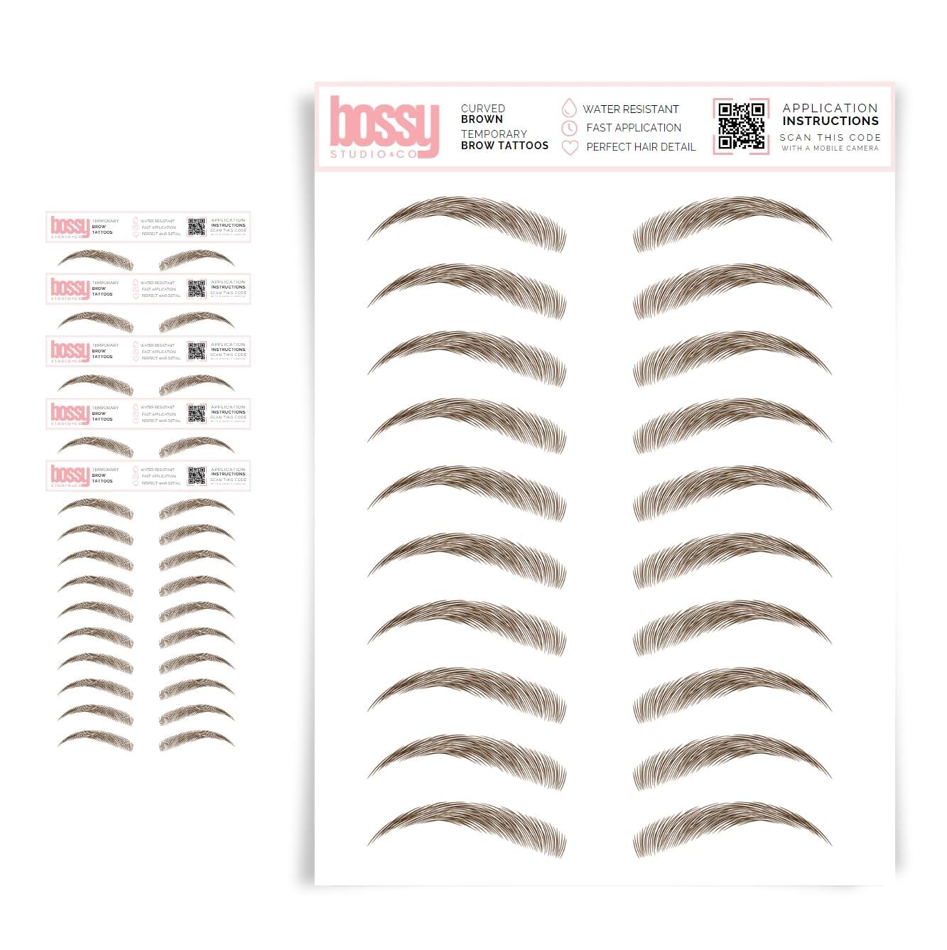 - EXCLUSIVE COLORS & STYLES Bossy Studio & Co is the original temporary brow tattoo. Weve created the largest selection of exclusive colors that are only available here. Our brow sheets are custom designed with premium adhesive for the longest-lasting results. Every eyebrow is identical and realistic in size so each pair is wearable. No more over-sized brows, our premium brow tattoos are designed by real brow experts which means youll only find realistic sizing and natural colors in our options.