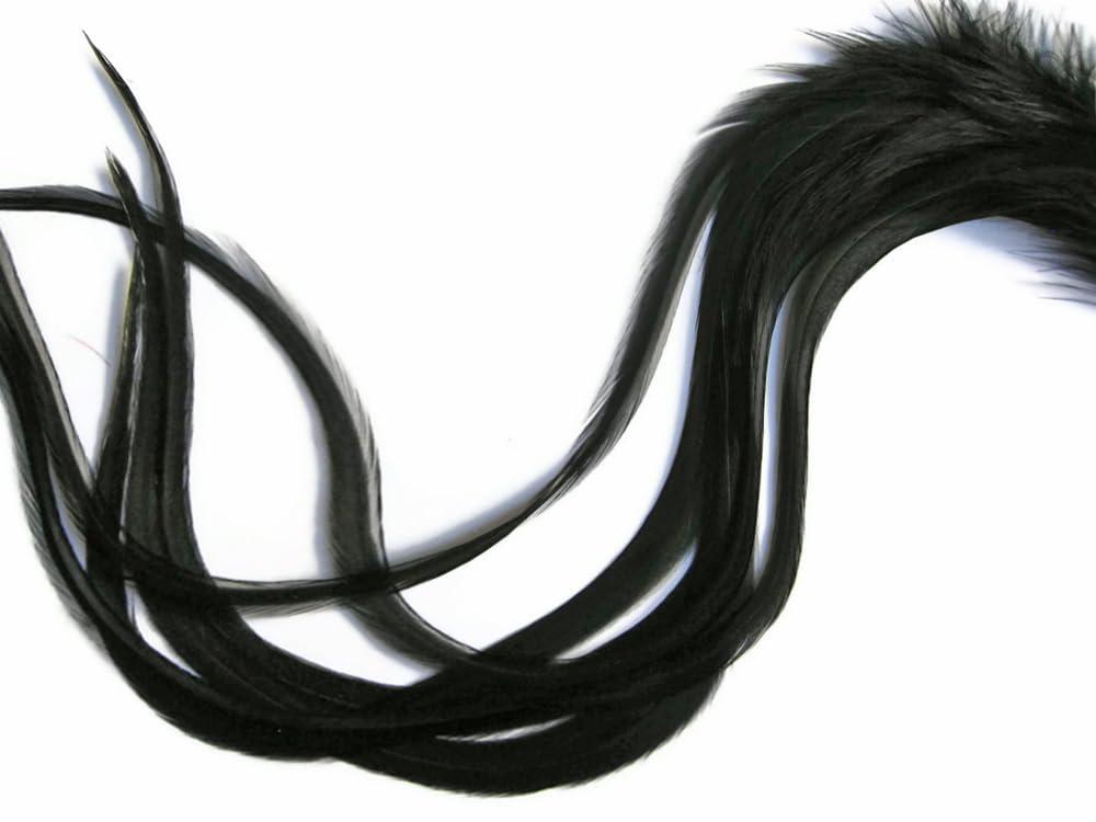This listing is for 6 individual premium quality genetic rooster hair extension feathers. Feathers range from 11.5 inches and up. They are thick feathers that have fluff on the tip of the strand. These feathers are unique and breed in USA which was originally used for fly tying.Who knew being fierce could be so easy? These Solid Black Extra Long Thick rooster feathers are sure to amp up your look with some serious attitude! Put just these black rooster hair extension feathers in your hair as fierce lowlights or pair them with other feathers to make a perfect color combination!The characteristic of these feathers is long and soft. Therefore it is very popular for HAIR EXTENSION and long feather earrings! They are extremely beautiful and other uses include jewelry making, arts and crafts, party decorations and you can also see them on fashion runway. You can wash, curl and dry them just like your hair!Feathers vary widely in shape and size and all feathers are unique. Some ends might not be perfect but you can easily trim it with scissor.Wholesale and bulk purchase of these rooster feathers is available upon request.