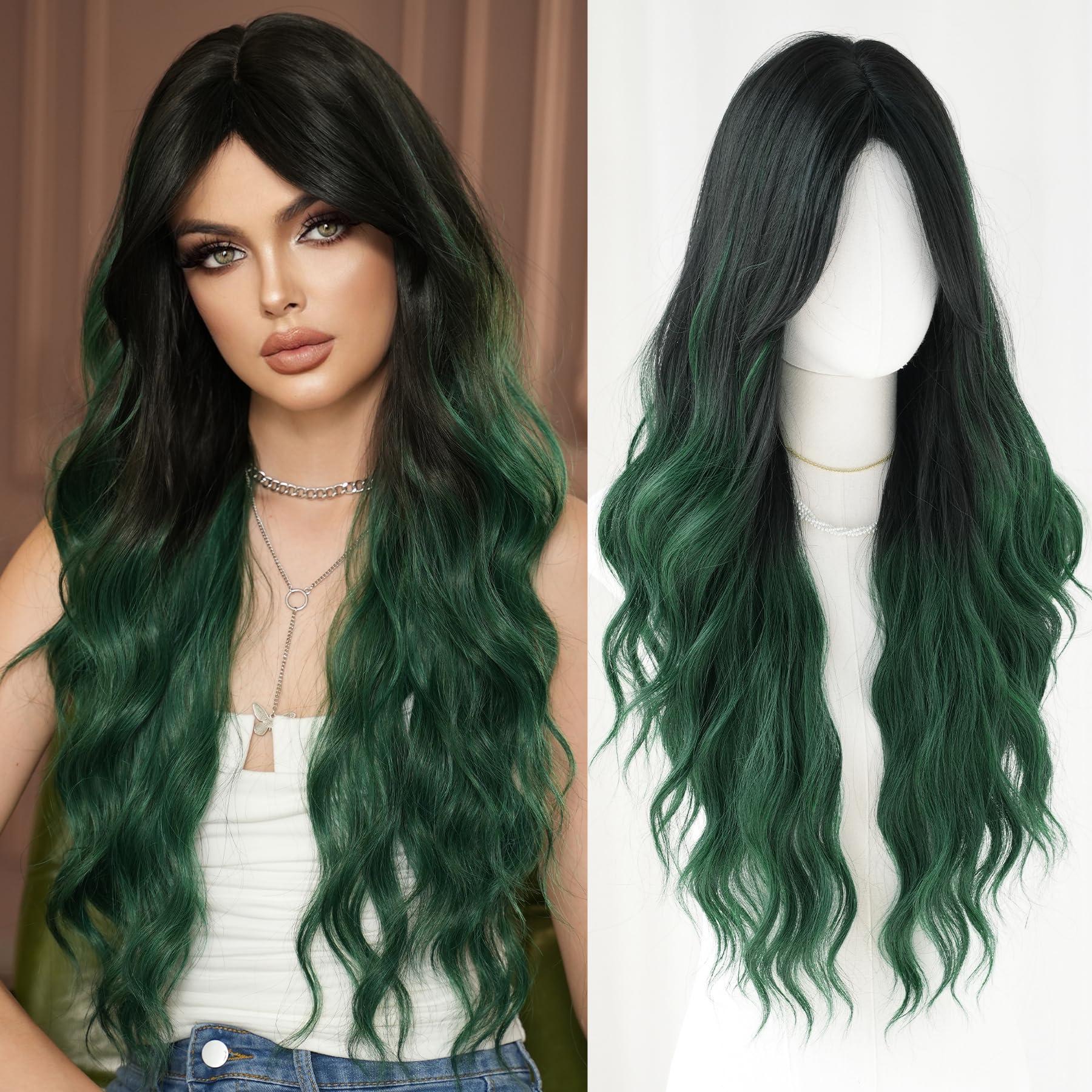 - High quality material full synthetic Heat Resistant Fibre of best dark green ombre natural black wigs with dark roots, cheap price and soft hair and comfortable to wear.We have a beautiful gift box packaging, including ultra-long curly wavy natural curtain bangs wigs. A beautiful pair of false eyelashes is included as well as two hair nets and hair clips.