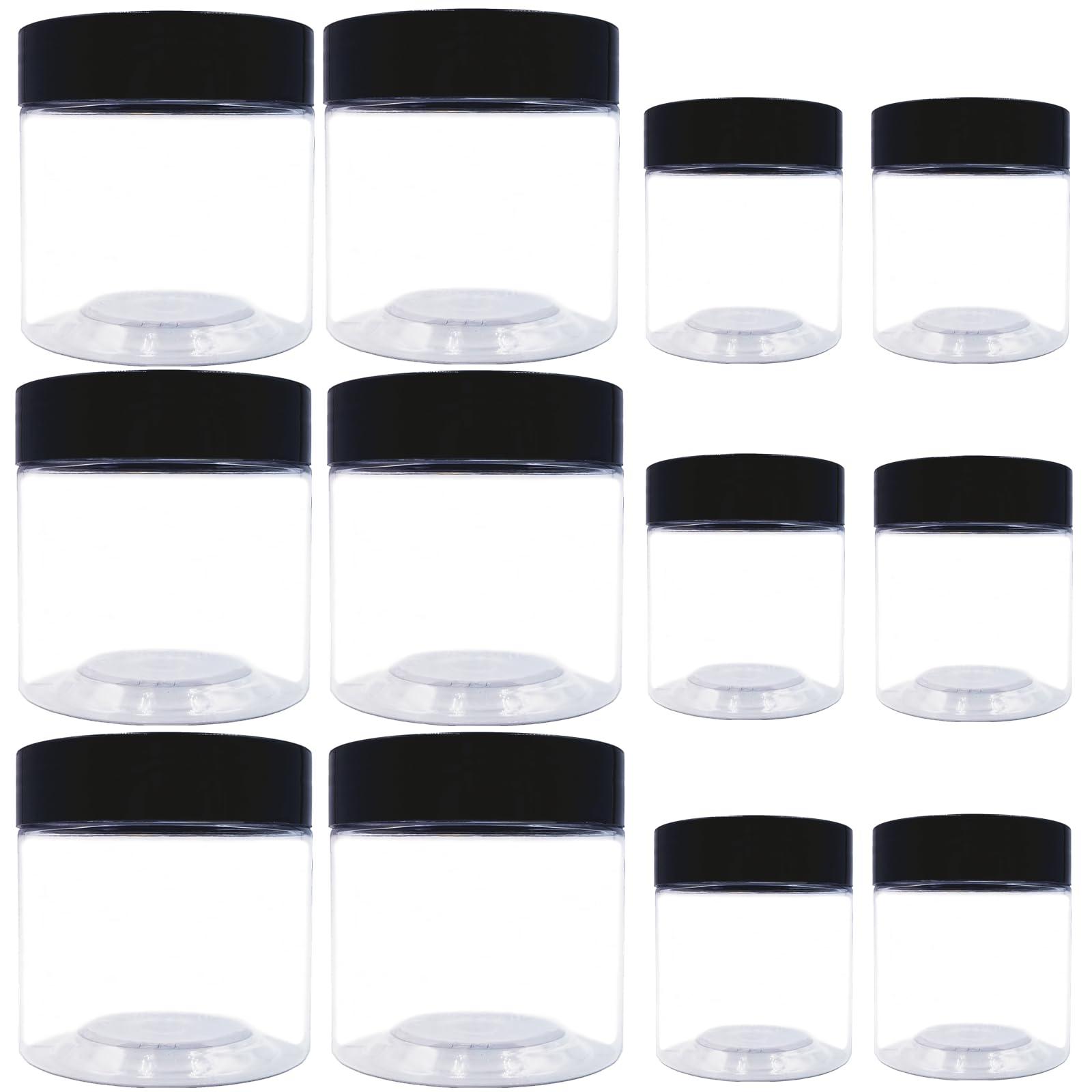 - VALUE PACK:You will get 12pcs(8 oz and 4 oz) clear plastic cosmetic jars with black lids and 12pcs labels.extra 12pcs pressure sensitive gaskets