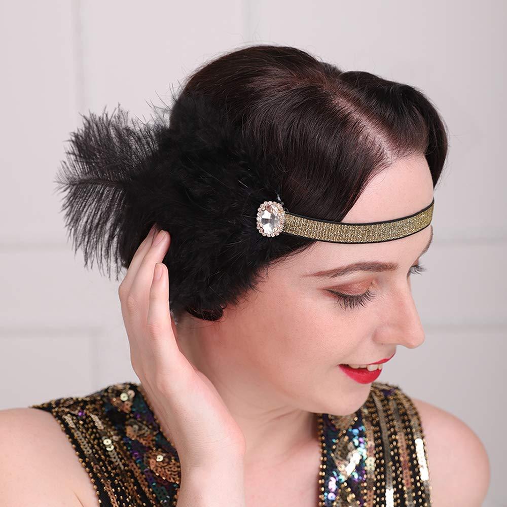 Aimimier 1920s Flapper Feather Headband Black with Elastic Hair Band Costume Roaring 20s Feather Headpiece Hair Accessories for Women
