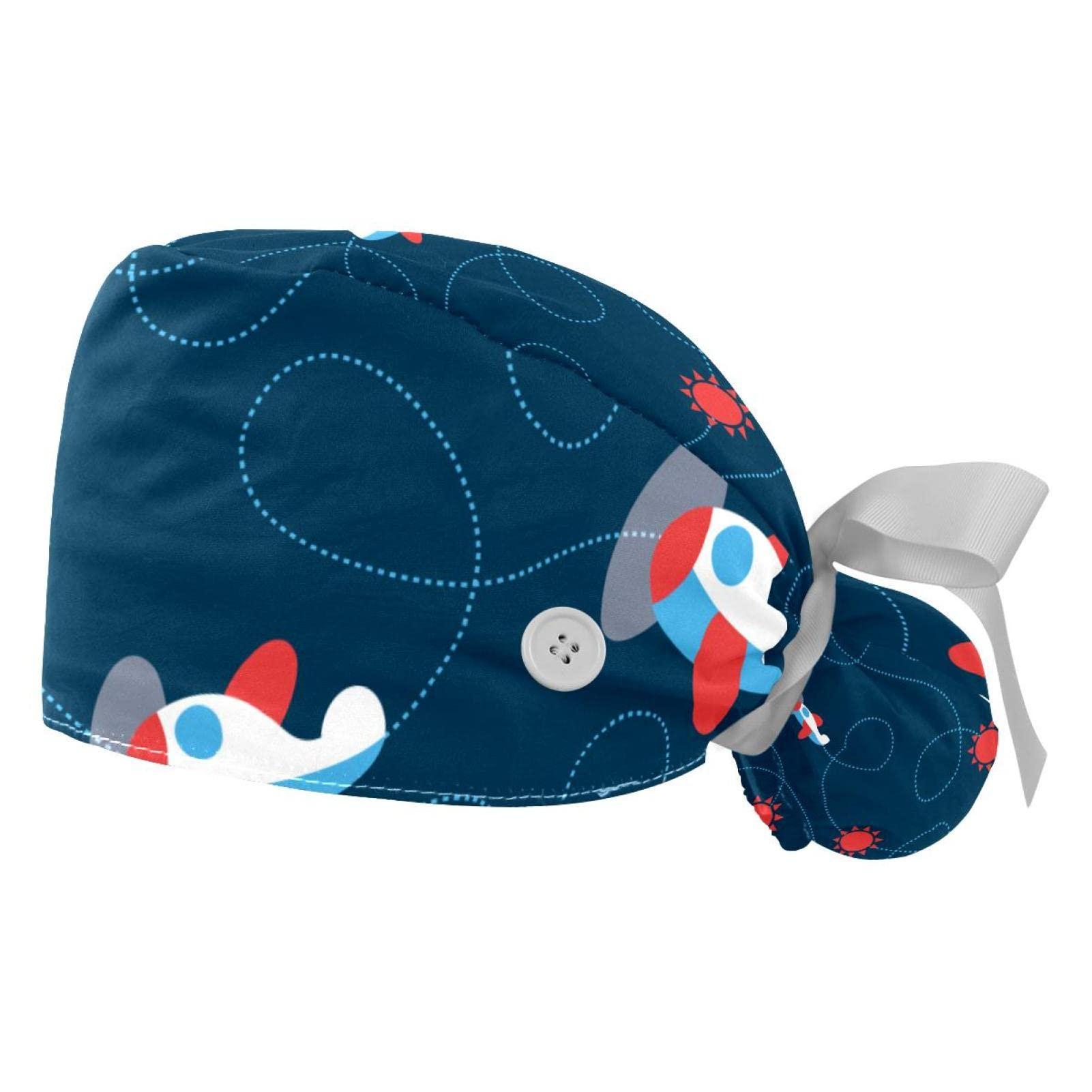 Lyetny Aircraft Airplane Plain Aeroplane Scrub Caps Hats Women Bouffant Working Hat Ponytail Holder for Women Long Hair Covers 2PCS