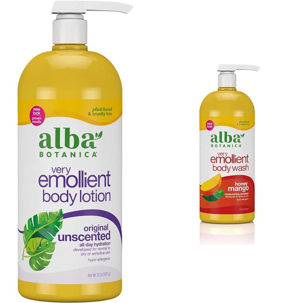 Alba Botanica Very Emollient Unscented 32 Oz Body Lotion and Honey Mango 32 Oz Body Wash Bundle