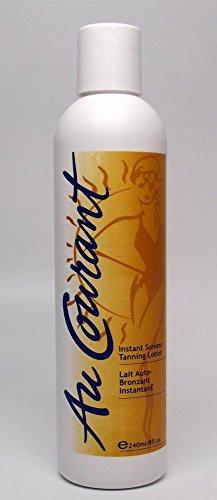 Au Courant sunless lotion for a long lasting safe tan. Added bronzer gives you instant color while your tan develops to a deeper color in 3-5 hours. Unique built in bronzer works as a guide. No more missed spots or application errors with Au Courant Instant Sunless Tanning Lotion.