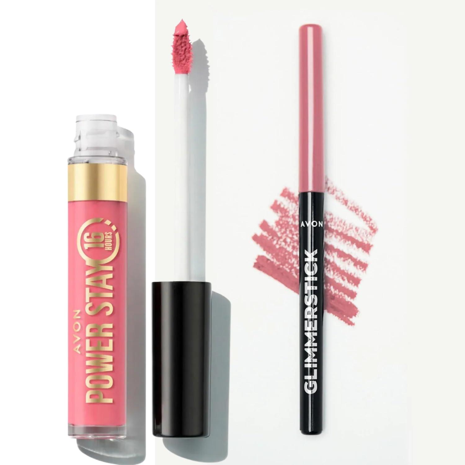 AVON Power Stay Liquid Lip Colour 16 HOURS and Glimmerstick Lip Liner SET! (Persistent Pink-Pink Cashmere)