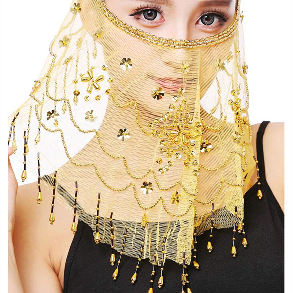 Elevate your dance routine or Halloween costume to new heights with the Tribal Belly Dance Face Veil with Beads and Sequins. Crafted with elegance and attention to detail, this face veil is a must-have accessory for any belly dancer, performer, or costume enthusiast.Made from the fine mesh fabric, this face veil offers a luxurious feel against your skin. Its soft and lightweight nature allows for effortless movement and enhances your overall performance. The mesmerizing gold or silver sequins and beads delicately embellish the veil, creating an enchanting visual effect that captivates your audience. Not limited to belly dance outfits, this face veil adds a touch of allure to Halloween costumes, stage shows, and festivals. It's also long enough to be used as a stylish scarf, allowing you to experiment with different looks and styles. Unleash your inner dancer and make a statement with the Exquisite Tribal Belly Dance Face Veil.