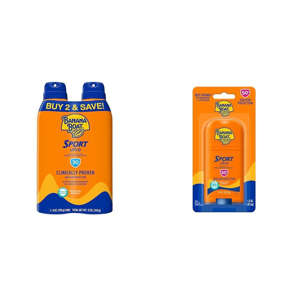 This Banana Boat sunscreen bundle includes a twin pack of 6oz Banana Boat Sport Ultra Clear Spray SPF 30 sunscreen along with a 1.5oz Banana Boat Sport Ultra reef-friendly SPF 50 sunscreen stick. The lightweight spray formulation provides broad spectrum UVA/UVB protection, is non-greasy, absorbs quickly into skin, and is sweat and water resistant for up to 80 minutes, making it ideal for active lifestyles. The included sunscreen stick offers easy application in a solid formula with the same high-performance sweat and water resistance. Both sunscreens are oxybenzone and octinoxate free to help protect marine environments. With one SPF 30 and one SPF 50 option, this bundle offers versatile protection levels to meet different sun exposure needs. The spray formulation spreads easily over large areas of exposed skin while the solid stick applicator is convenient for targeted application on the face. Together these complementary sunscreens provide high-performance, eco-friendly protection tailored for an active, outdoor lifestyle.