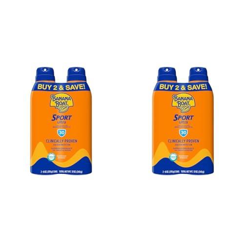 Great for your active lifestyle! Banana Boat Sport Ultra Clear Spray Sunscreen provides strong, free-from-oxybenzone protection that absorbs quickly, is non-greasy and won't run into your eyes. This lightweight, clear SPF 30 sunscreen spray is designed especially for sport enthusiasts and other active individuals who need sport-strength sun protection that doesnt play around! The Banana Boat Sport Ultra Clear Spray Sunscreen Twin Pack has superior endurance versus sweat and water and lasts as long as the fun does*! *Reapply this safe and effective broad spectrum UVA and UVB protection as directed on the product label. Protect the fun on earth with Banana Boat!