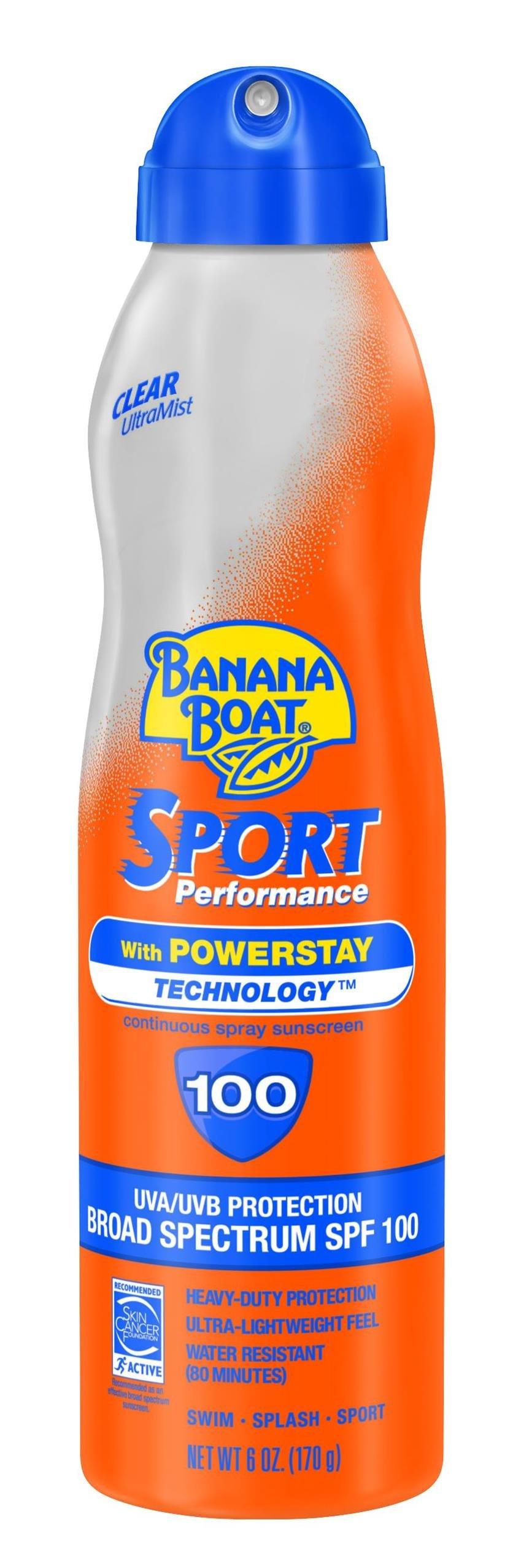Banana boat ultraist sport performance sunscreen SPF 100 delivers the highest level of spray protection for any sport activity. This formula protects skin from sunburn and long-term damage by providing advanced UVA/UVB protection. It goes on easily and is proven to be long-lasting and very water/sweat resistant, with no greasy feel. Just spray and go. 6 FL OZ (170 g) - SPF 100.