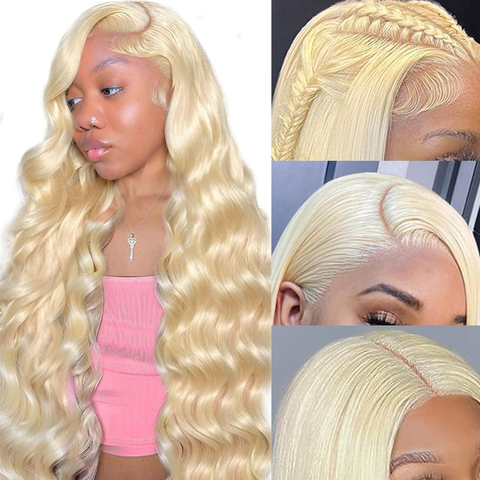 - Blonde Lace Front Wigs Material: 100% unprocessed 16A brazilian virgin human hair, 210% density body wave wigs, knots are very small and can be bleached. easy to be dyed, and takes color very well.