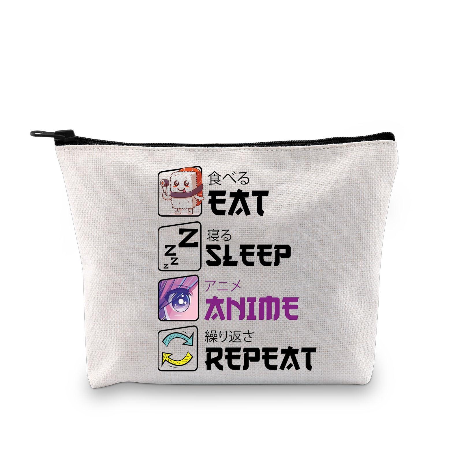 - Bag with Lettering: EAT SLEEP ANIME REPEAT SLEEP. Do you love anime stream manga movies, series? Is an anime cosplay Japanese animation fan? Then this cute cosmetic bag is the perfect gift for big anime fans.