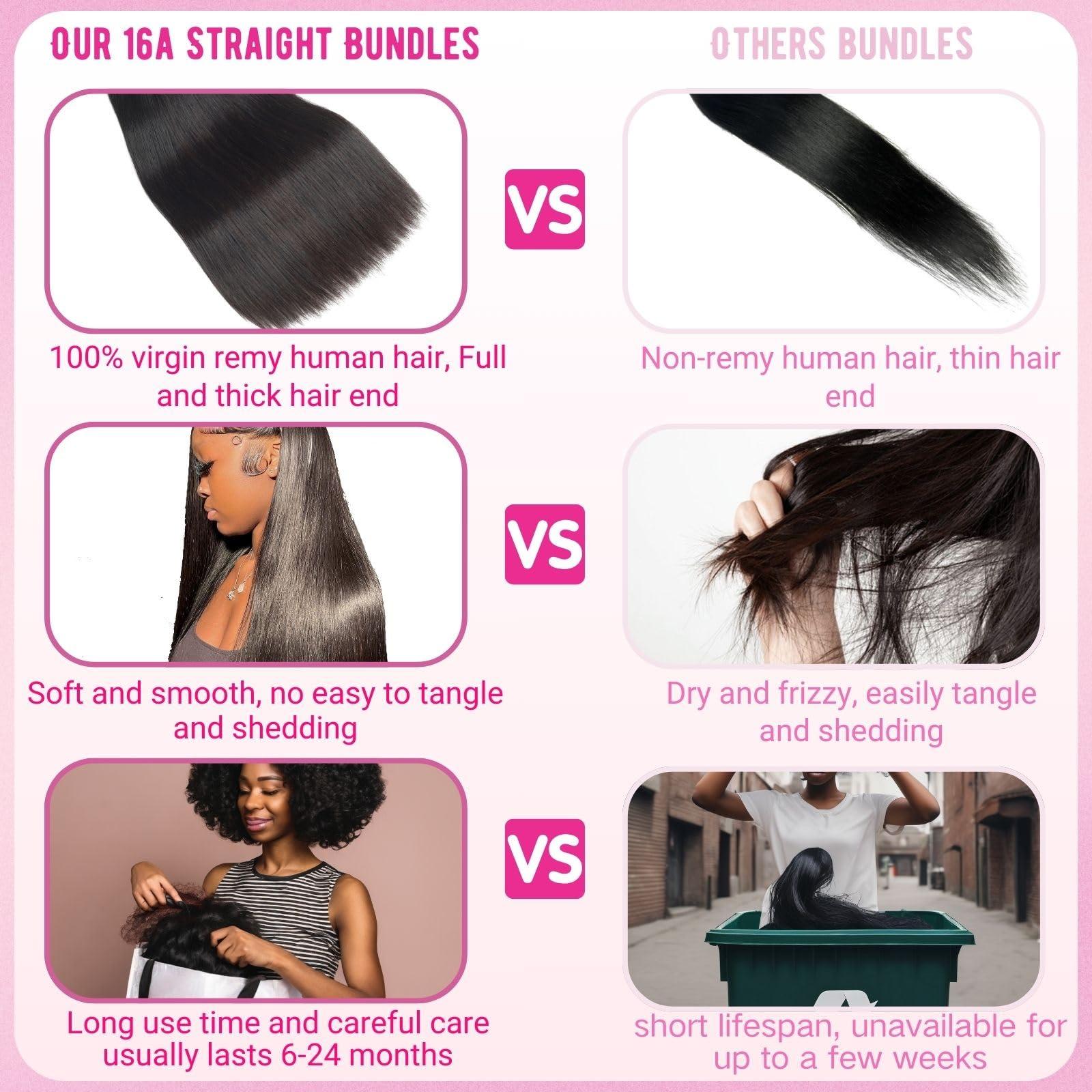 - 16A Straight Bundles Human Hair Meterial100% unprocessed brazilian straight human hair bundles, cut from the young girl donor, ensuring a natural, smooth, and soft texture,straight human hair bundles are thick and full ,seamless blend with your own hair, creating a flawless and undetectable look.