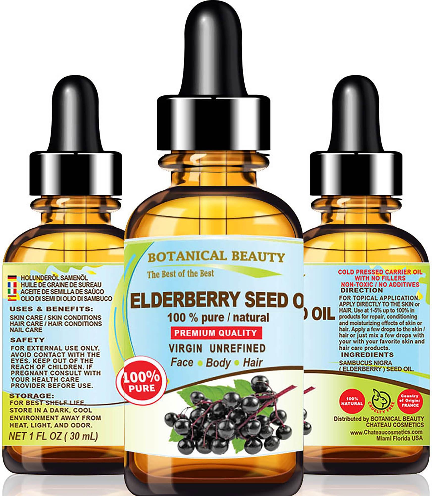 - Botanical Beauty ELDERBERRY SEED OIL Sambucus Nigra is 100% PURE UNREFINED EXTRA VIRGIN RAW with no additives. It is extremely rich in essential fatty acids, Omega 6, Vitamin E and Vitamin A. Little Goes a Long Way, Absorbs Quickly, Not Greasy, Chemical Free, Not tested on Animals, Does not contain any preservatives.