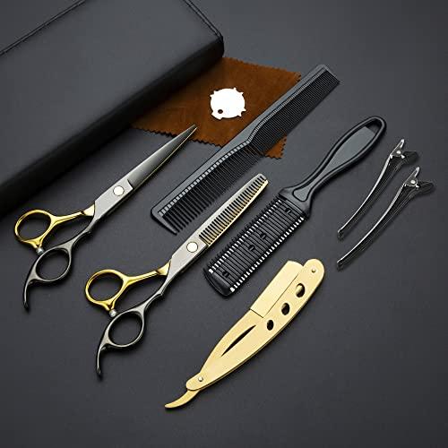 - Package Included1*Straight Scissor, 1*Thinning Scissor, 1*Gold Razor (The razor contains blades, please use with care),1*Hair comb,1*Hair cutting comb,2*Hairdressing clip, 1*Gift Leather Bag, 1*Cleaning Cloth, 1*Scissors Adjuster.With an overall length of 6.8 inches and 3.8 inches of Blades, this Scissors for hair is safe and easy to use on men, women, the elderly, kids, and babies. These barber shears is also ideal to use in hair salon.