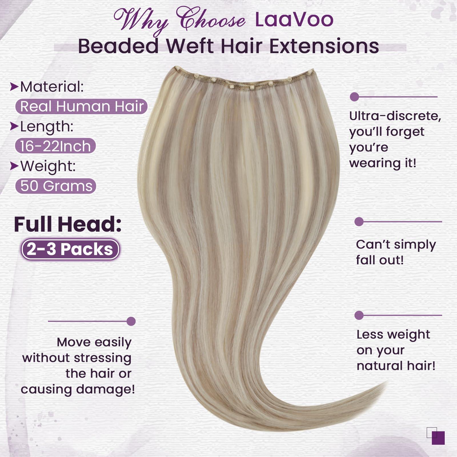LAAVOO LaaVoo Beaded Weft Hair Extensions Ash Blonde Bead Hair Extensions Real Human Hair Weft Hair Extensions Bleach Blonde with Ash Blonde with Micro Beaded 22inch 50g