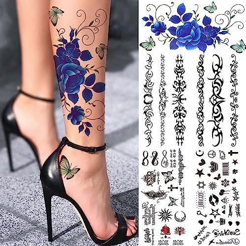 TTHUONG THATHU Blue Rose Lace Temporary Tattoos Fro Women Kids Infinity Face Tattoo Feather Sticker Body Art Small Tatoo 3D