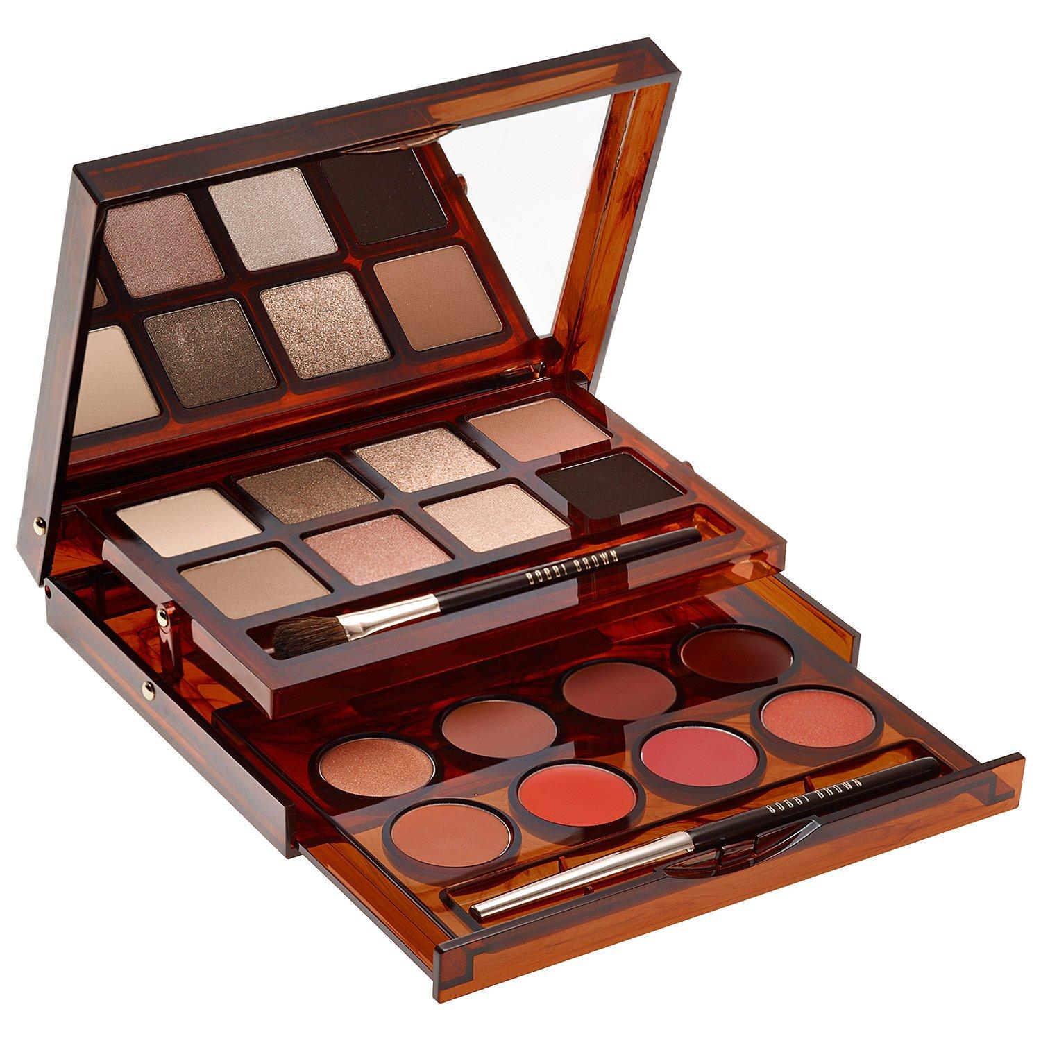 - 8 x 0.35 oz Eye shadows in Ivory (creamy white), Sandy Rose Metallic (silver plum mauve), Chiffon Sparkle (pale gold), Antique Rose (rosy brown), Malted (soft grey-brown), Bronzed Pink Metallic (mid-tone shimmering pink), Cream Metallic (shimmering creamy white), Black Chocolate Eye (rich black brown) - 8 x 0.15 oz Creamy Lip Color in Pink Sequin (sheer pinky peach), Pale Mauve (sheer pink mauve), Blue Raspberry (blue raspberry pink), Black Cherry (rich berry red), Pale Beige (nude pinky beige), Coral Pink (bright warm pink), Pink Blossom (mid-tone blue pink), Rose Garden (mid-tone shimmer rose) - Mini eye shadow and lip brush
