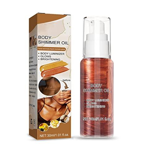 Product Feature:\n\nItembody shimmer oil\n\n1.Create a shimmer glow, enhance natural shiny skin tone.\n\n2.Lightweight and smooth, just looks glowy and radiant.\n\n3.Make your body and face look more shiny. Long-lasting and easy to color.\n\n4.Waterproof and anti-perspiration formula make the makeup light, long lasting and natural.