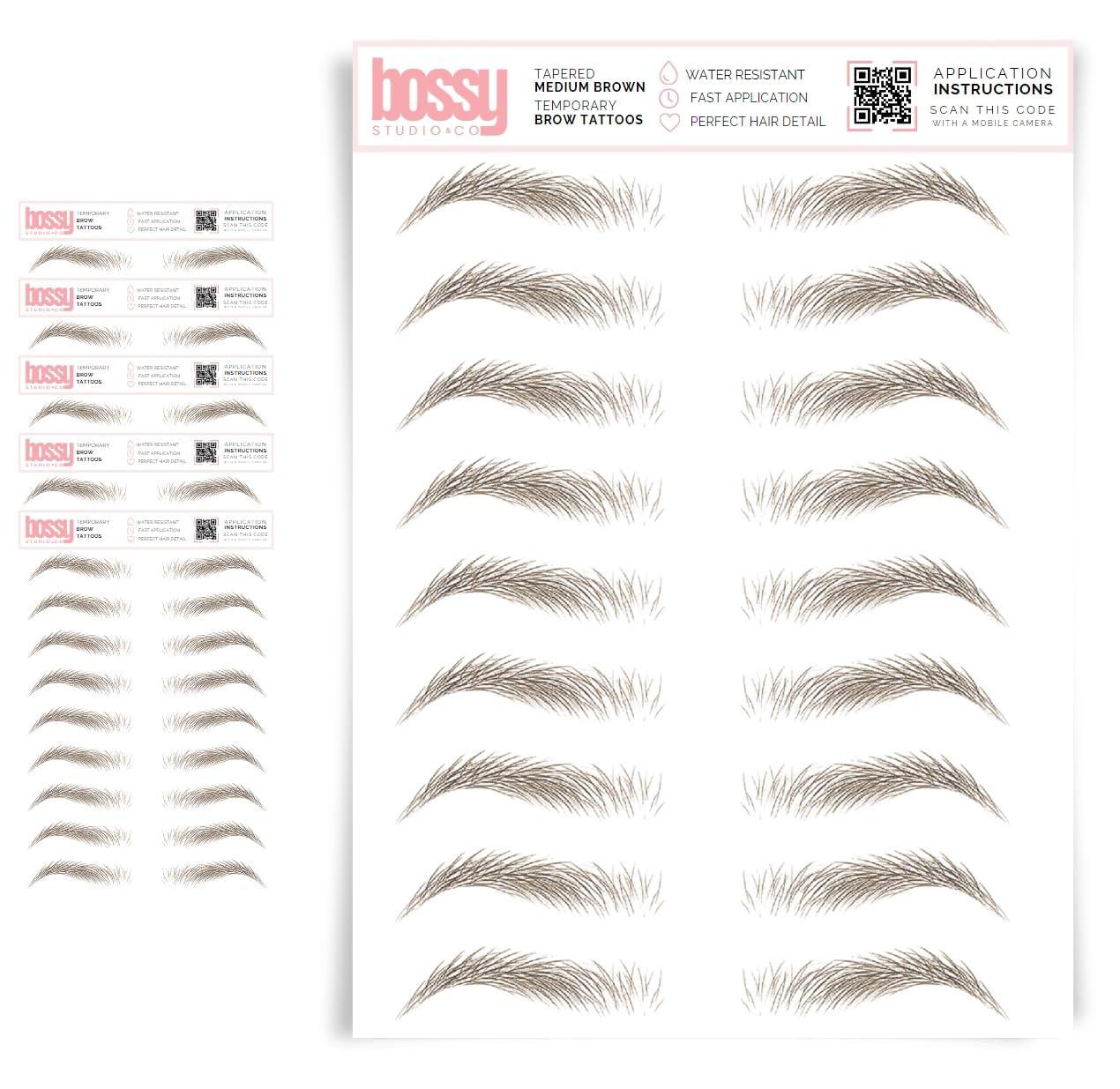 - EXCLUSIVE COLORS & STYLES Bossy Studio & Co is the original temporary brow tattoo. Weve created the largest selection of exclusive colors that are only available here. Our brow sheets are custom designed with premium adhesive for the longest-lasting results. Every eyebrow is identical and realistic in size so each pair is wearable. No more over-sized brows, our premium brow tattoos are designed by real brow experts which means youll only find realistic sizing and natural colors in our options.