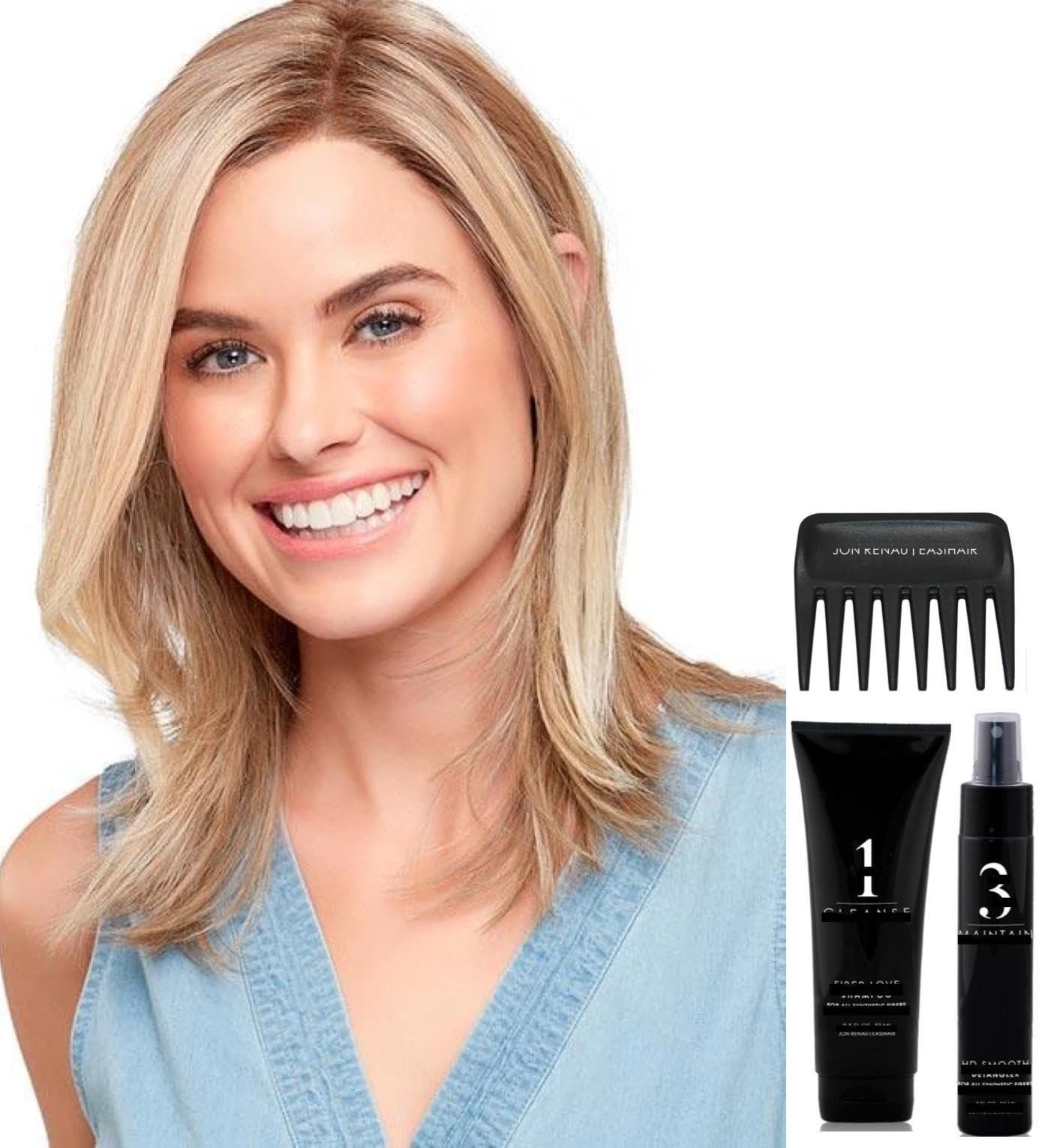 BUNDLE - 5 Items: Drew Heat Friendly Synthetic Wig by Jon Renau, Christy's Wigs Q & A Booklet, HD Smooth Detangler, Synthetic Shampoo & Wide Tooth Comb. DESCRIPTION: Drew is a lace front wig by Jon Renau and is a classic mid-length layered style. The heat defiant synthetic fiber stands up to heat and humidity and allows for styling versatility. Layers along the fringe frame the face to perfection. Long layers throughout the sides and back give the hair gorgeous movement. SmartLace and a monofilament feature allows for styling away from the face and parting versatility. Drew is a vibrant beauty! HOW TO THE STYLE: Ready to wear out of box. Fingerstyle to achieve the best styling results. NOTE: Style may look slightly different on you than the model based off of your face shape/size, neck length & forehead size. Ideal Face Shape: Diamond, Heart, Oblong, Oval, Round. NOTE: Color may be different than expected based off of the hair color against your personal skin tone, color of your shirt & lighting you are in (indoor/outdoor, fluorescent/white lights etc). THIS IS NOT A DEFECT because each person is simply different. The best representation of color is in natural lighting. NOTE: Please select the color you want based off of the color options on the right of the product page. Do not assume you are getting the color on the model. NOTE: Color is not only subjective to each person but also can look different on different computer monitors. NOTE: This wig has a cap size of Average, this means the circumference is appox. 21.5 around from hairline to nape of neck. Each wig stretches a half inch larger or smaller using the adjustable straps. For measuring help, please contact us.