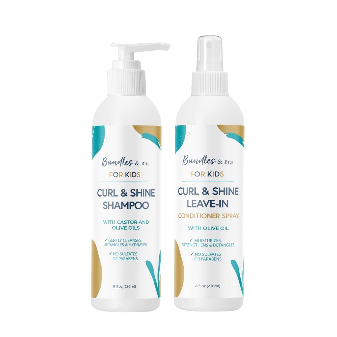 Bundles & Bits KIDS Shampoo and Leave-In Conditioner Spray - Gently Cleanses, Nourishes and Detangles Curly Hair - Plant-Based, Sulfate & Paraben Free, 2 pieces, 8 oz each