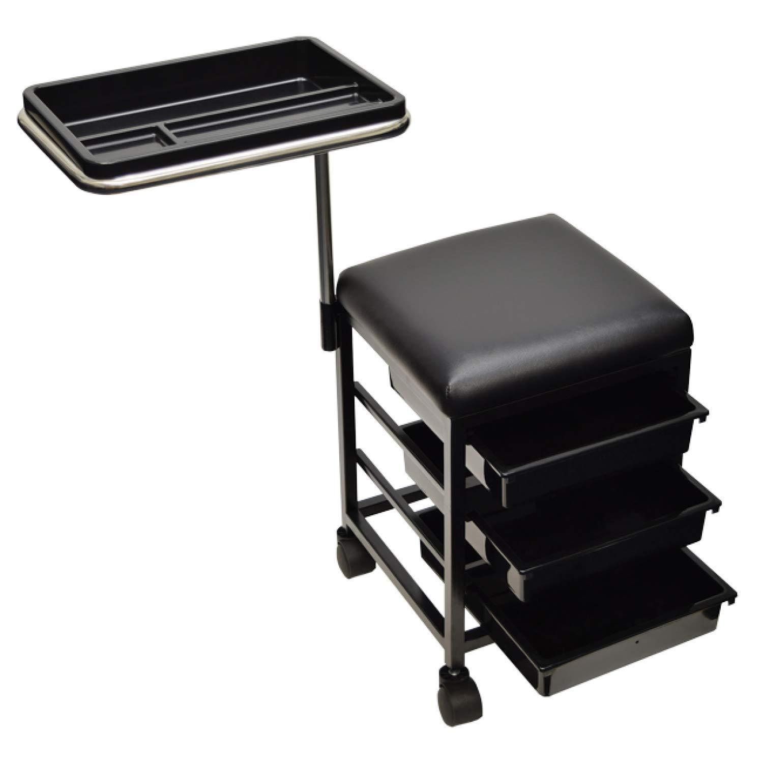 Pedicure cart features a comfortable, leather-like cushioned seat, 3 sliding storage drawers, and an attached swivel tray with dividers. Pedicure cart height: 19"H. Sliding drawers measure: 10-3/4"L x 12-3/4"W x 2-1/4"D. Tray measures: 9-1/2"L x 13"W.