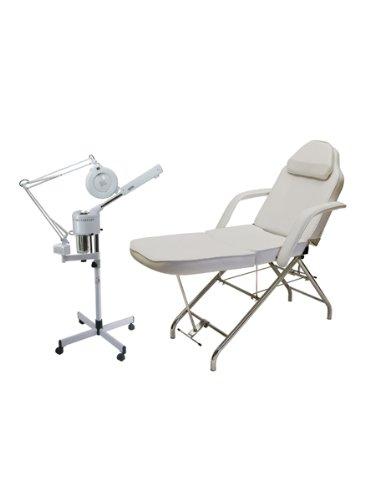 - Each set includes a facial bed measuring 68 inches long, 22 inches wide (29 inches wide with arms), and 26 inches high, with a 300-pound capacity, and 58-inch-tall steamer with 22-inch-long arm.