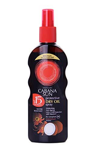 Cabana dry oil spray SPF15 provides all over body and scalp protection from harmful UVA and UVB rays. Cabanas 30-strong product range has every aspect of sun care covered, from dry oil spray and tropical Sun lotion to carrot oil spray. Cabana provides a rich, deep tan while also ensuring your skin is protected from the suns harmful rays. Its perfect for anyone who enjoys the sun and getting a gorgeous tan, but also wants to have healthy and younger-looking skin.