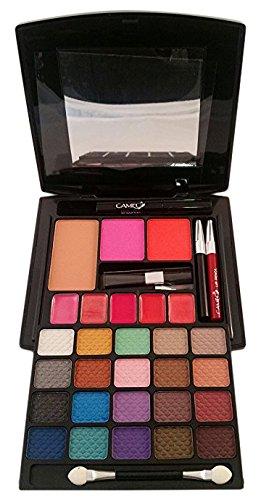 20 Eyeshadows, 5 Lip color, 2 Blushers, 1 Press powder 1 Mascara, 1 Lip pencil, 1 Eye pencil, Applicator Small and compact 5 X 5.4 kit can fit easily in your purse The tray with the eyeshaows slides in and out to save room Elegant case with a mirror. Comes in a 4 color box for a great gift idea.
