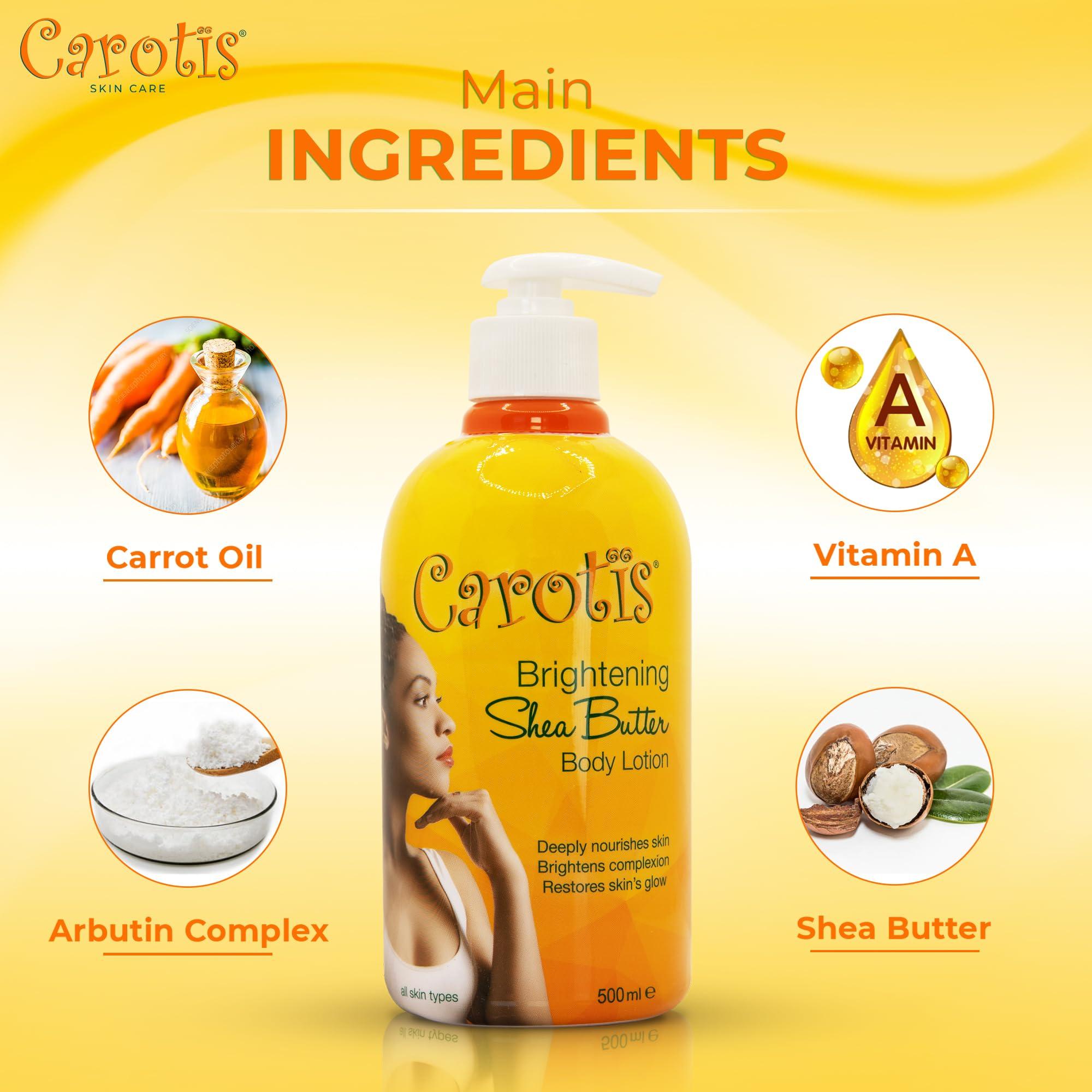 - MAXIMISE THE BENEFITS: Apply a thin layer of Carotis Shea Butter Body Lotion to dark spots on dry, cleansed skin twice a day. Avoid eye area. Follow up with minimum SPF 30 sun protection daily during and after treatment in order to prevent further skin discoloration.