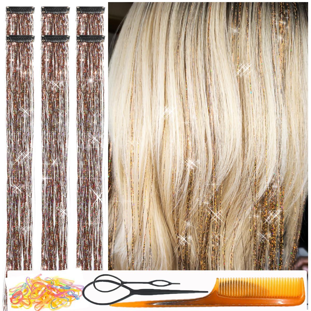 - Upgraded Density and Length: Each Pc of Hair Tinsel Is Implanted with 80 Strands Of High-Quality Polyester Fiber, Which Is Hand-Refined, Making The Hair More Dense and Shiny, and The Length Is Extended to 24 Inches, Which Can Maximize The Luster And Flash.Complimentary: 1Pcs Rat Tail Comb , 2Pcs Ponytail Hoop Tools and A Bag of Rubber Bands.