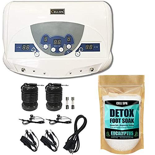 Product Features This unit comes with the following: 16 Ounce Premium Eucalyptus Scented Epsom Salt, 2 arrays, 2 wrist strap, 1 power cord, 2 ear phone plugs, 1 carrying box and 1 instruction book. Cell Spa Detox Foot Bath Premium 16 Ounce Eucalyptus Scented Epsom Salt Crystal Magnesium Sulfate To Help Detox, Relax, Relieve Stress, Promote Healthy Toenail, Eliminate Odors & Soften Your Feet. For Foot Soaks: Dissolve 1 1/2 tablespoon (1 ounce) of Epsom Salt in a foot tub of 1 gallon of warm water. Soak for 20 minutes for the relaxation of your feet. For Foot Detox Session: Please use clean filtered water. Never use well or spring water. Please use 1-2 wooden teaspoon (2 grams) of Epsom Salt in a foot tub of 2 gallons of warm water for the best ionization inside the water. Please do not add the Epsom Salt if the E factor reaches 2.0 for the Cell Spa Detox machines. If too much salt is added, your machine can alarm and stop working. When the machine alarms or stops, please drain the water and redo with clean filtered water without any salt. Please do not add the Epsom Salt if the E factor reaches 2.0 for the Cell Spa Detox machines. The optimal E or PH factor should be around 1.2- 1.5.Product Description