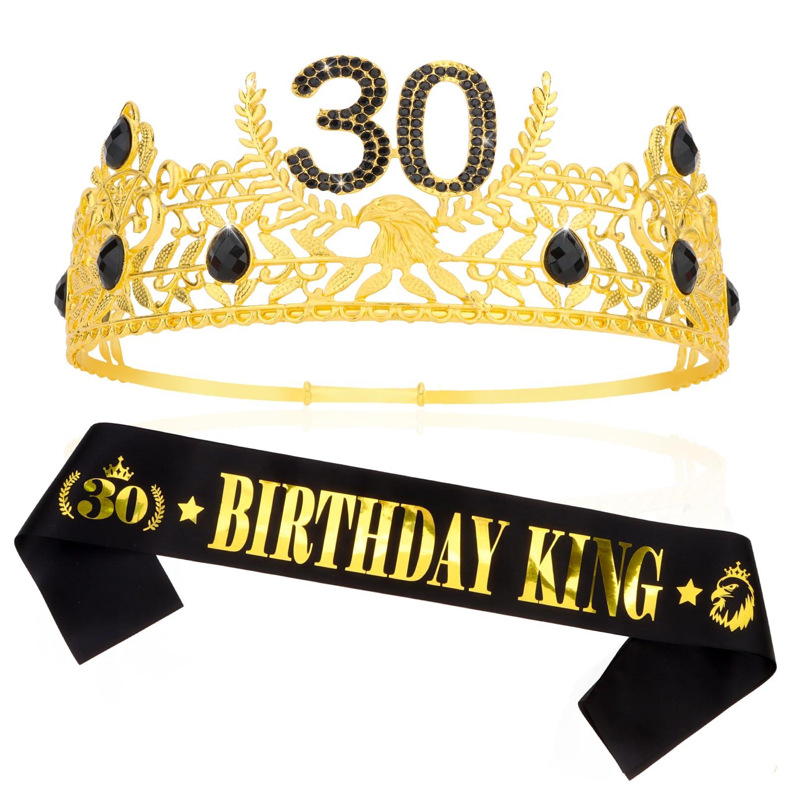 - The Perfect 30th Birthday Decorations for Men: "30TH BIRTHDAY KING" sash + gold king crown.