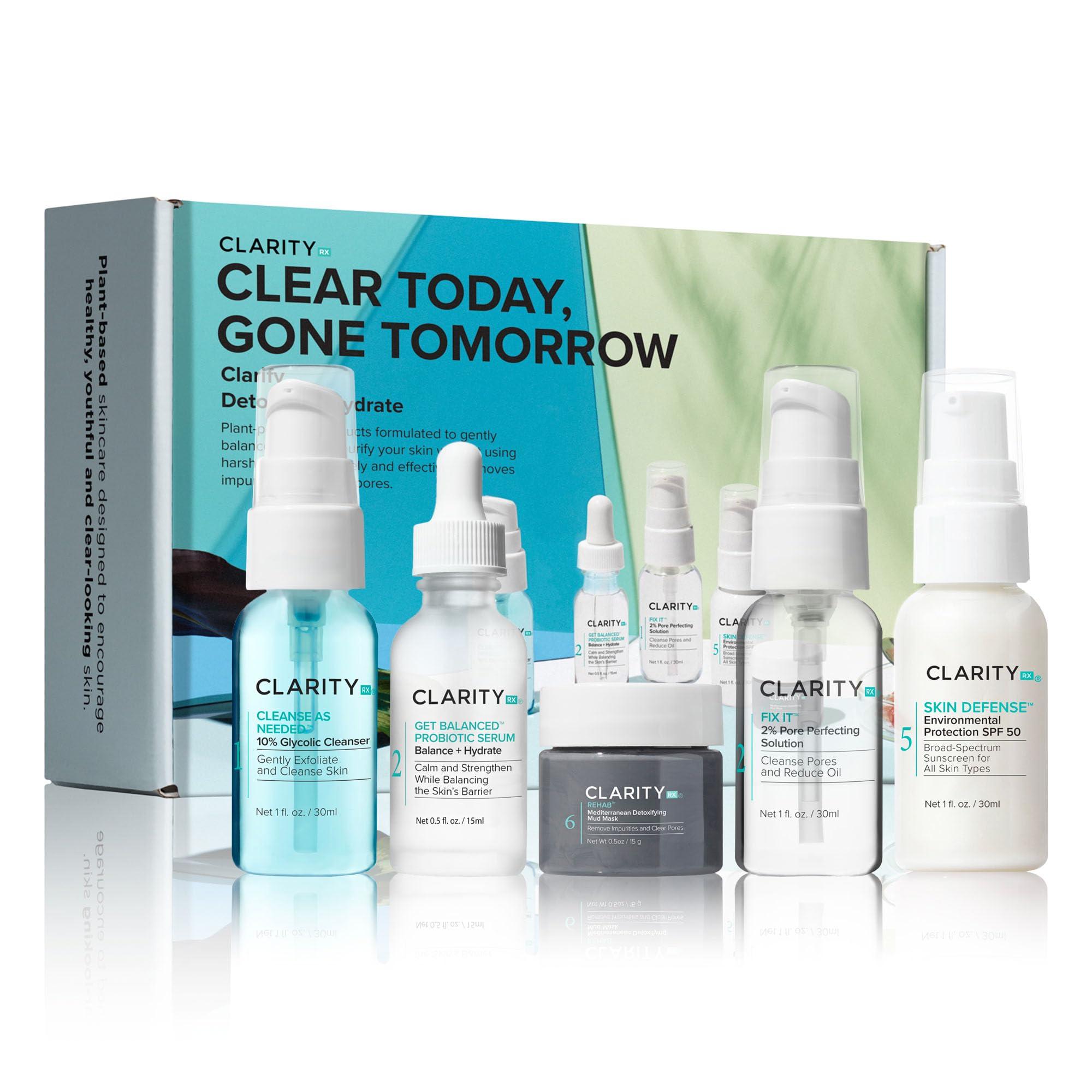 Introducing Clear Today, Gone Tomorrow, our latest and most effective skin care kit that helps you clarify, detoxify, and protect acne-prone skin. Recommended for oily, congested, pimple-prone skin, this five-piece set features our best skin-refining solutions, plus a free-radical-fighting facial sunscreen. Included are our Cleanse As Needed 10% Glycolic Acid Cleanser (1 fl oz), Get Balanced Probiotic Serum (0.5 fl oz), Rehab Mediterranean Detoxifying Mud Mask (0.5 oz), Fix It 2% Pore Perfecting Solution (1 fl oz), and Skin Defense Environmental Protection SPF 50 (1 fl oz). Infused with probiotics, these advanced, plant-based products soothe irritation and support a balanced skin barrier while working to clear and prevent breakouts. ClarityRx skin care products are paraben free and made in the USA without the use of harsh retinols, added synthetic fragrance, Benzoyl Peroxides, and other harmful chemicals.