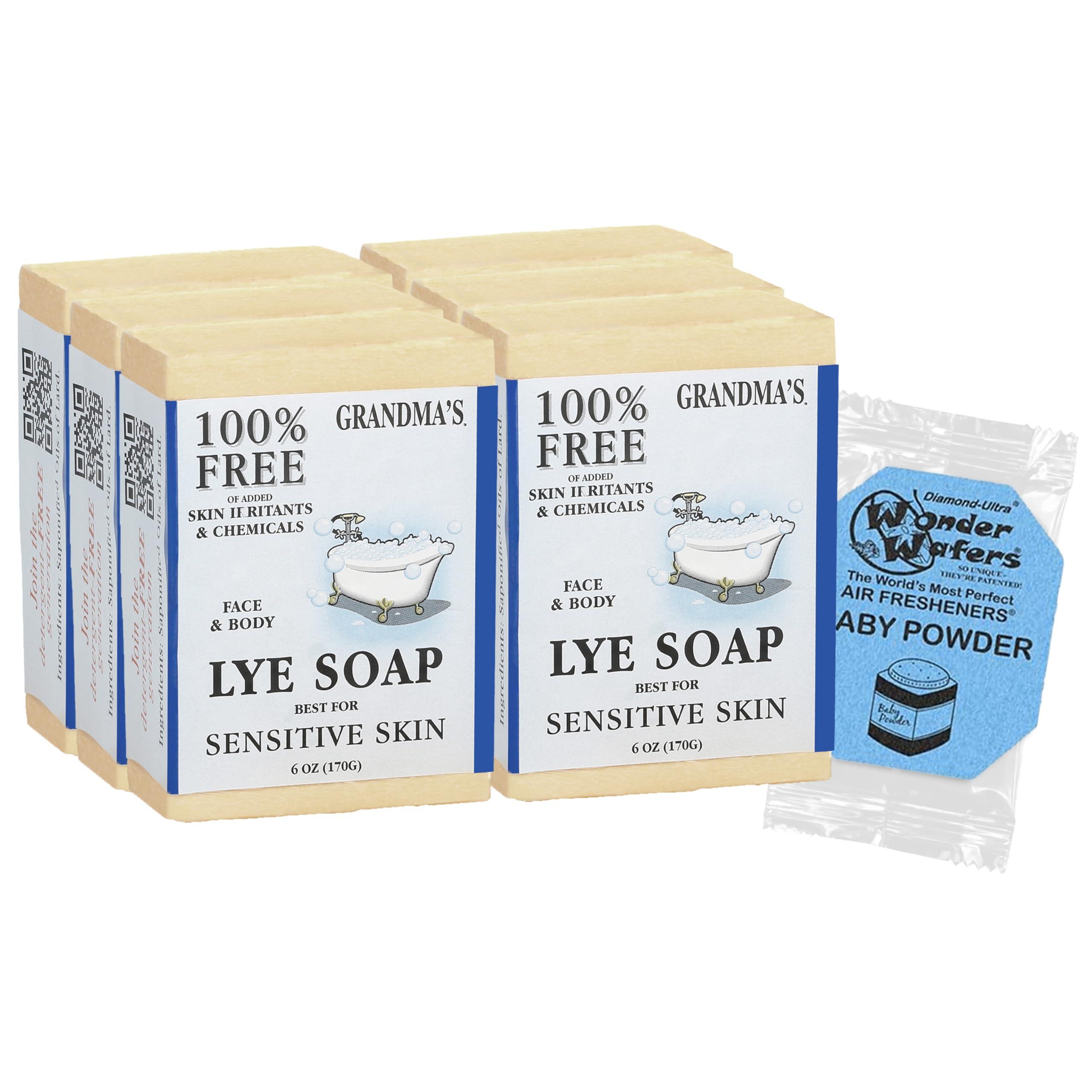 - NO ANIMAL TESTING: Manufactured in the USA. Economically designed, this giant bar lasts about a month, offering great value for your money while helping you maintain clean and healthy skin throughout your home. This bundle includes 6 bars of 6 oz Grandma's Lye Bar Soap and an Air Freshener (comes with Baby Powder but is subject to availability), offering a gentle cleansing option for sensitive skin.