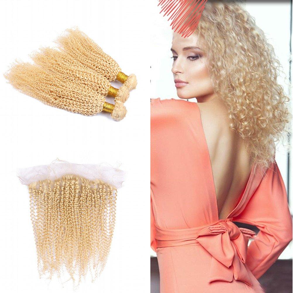 Cloud Hair Blonde 613 Kinky Curly Hair Weaves 3Pcs With Ear To Ear Frontal Brazilian Virgin Afro Curly Hair Weft With Top Closure 13x4 With Baby Hair (24 24 24+22 inch frontal)