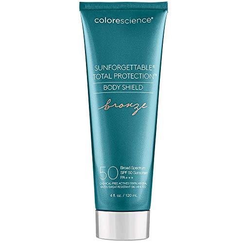 Product Description\n\nEnjoy a natural, sun-kissed glow all year long without the damage! This powerful protector features a beautiful bronze tint with our exclusive EnviroScreen Technology to provide 100% mineral protection from environmental aggressors such as UVA/UVB, pollution, blue light and infrared radiation. A hydrating and antioxidant-rich mineral formula nourishes and protects skin against free radicals that contribute to skin damage. Total protection in an elegant texture that blends easily into all skin tones and types with a weightless finish. Broad-spectrum SPF 50 is water/sweat resistant for 40 minutes. Dermatologist-tested, hypoallergenic, non-comedogenic, and reef safe. Our formula includes all-mineral, chemical-free active ingredients (Zinc Oxide: 12%) and is paraben-free, sulfate-free, phthalate-free, oil-free, dye-free and fragrance-free. HOW TO USE: Shake well before each use. Apply liberally and evenly to exposed areas. Reapply at least every two hours. NOTE that Body Shield Bronze is an all-mineral formula and is not meant to absorb into skin like self-tanners and stains. It will stay on until you wash it off!\n\nBrand Story\n\nWe\'re Colorescience, and we know healthy skin. From sunlight, to pollution, to free radicals, we believe in going way beyond UV. Were overprotective about preventing skin damage. And thats exactly why physicians love us.