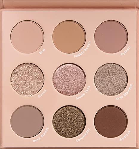 This cool-toned neutral makeup palette comes in 9 richly-pigmented shades with a unique combination of pressed powder shadows and pressed glitter. Our pressed powder shadow is a highly pigmented shadow that applies evenly and feels ultra-velvety and silky. This long-lasting formula contains a unique combination of softer powders which adheres easily, gives a soft focus effect, and blends smoothly and evenly. Our innovative and self-adhering pressed glitters make it easy to take your look to the next level. Applies effortlessly onto the skin and stays on all day and night -- dance party tested. A multi dimensional, highly reflective look is yours with the tap of your finger. Included in this palette are 9 shades; Boa, a matte pale rosey taupe, Pebble Beach, a matte medium chocolate, Python, a true matte taupe, Slated, a metallic icy taupe, Snake Eyes, a mid-tone rosey taupe, Cold Blooded, a metallic silver taupe, Rock Steady, a deepened matte taupe, Constrictor, a bronze metallic brown, and Bedrock, a dark matte brown.