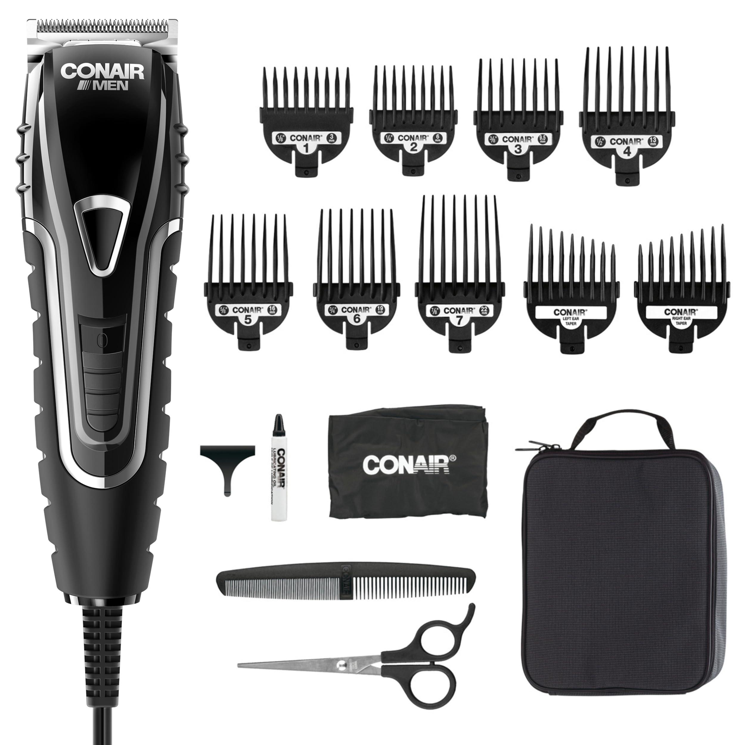 The Conair Men No-Slip Grip Haircutting and Trimming Kit has everything you need to achieve barbershop quality haircuts at home. This haircutting kit features a powerful hair clipper with a professional-grade DC motor to cut through all hair types. The sliding 5-position adjustable taper control makes it easy to blend, fade, or taper out your haircut for professional-looking results. Self-sharpening stainless steel blades are long-lasting, rustproof, and easy to clean, ensuring your clipper is ready to go in every hair emergency. The featured No-Slip Grip is highlighted by a unique shape and full rubber overmolding to ensure that if your hands get wet or slippery you never lose control. This provides a perfect haircut every time. Rounding out the 16-piece kit are 9 secure-fitting comb attachments for a variety of hair lengths (including left and right ear taper combs), a barber comb, barber scissors, a barber cape, a soft storage case, lubricating oil, and a blade guard for easy maintenance of the clipper blades.