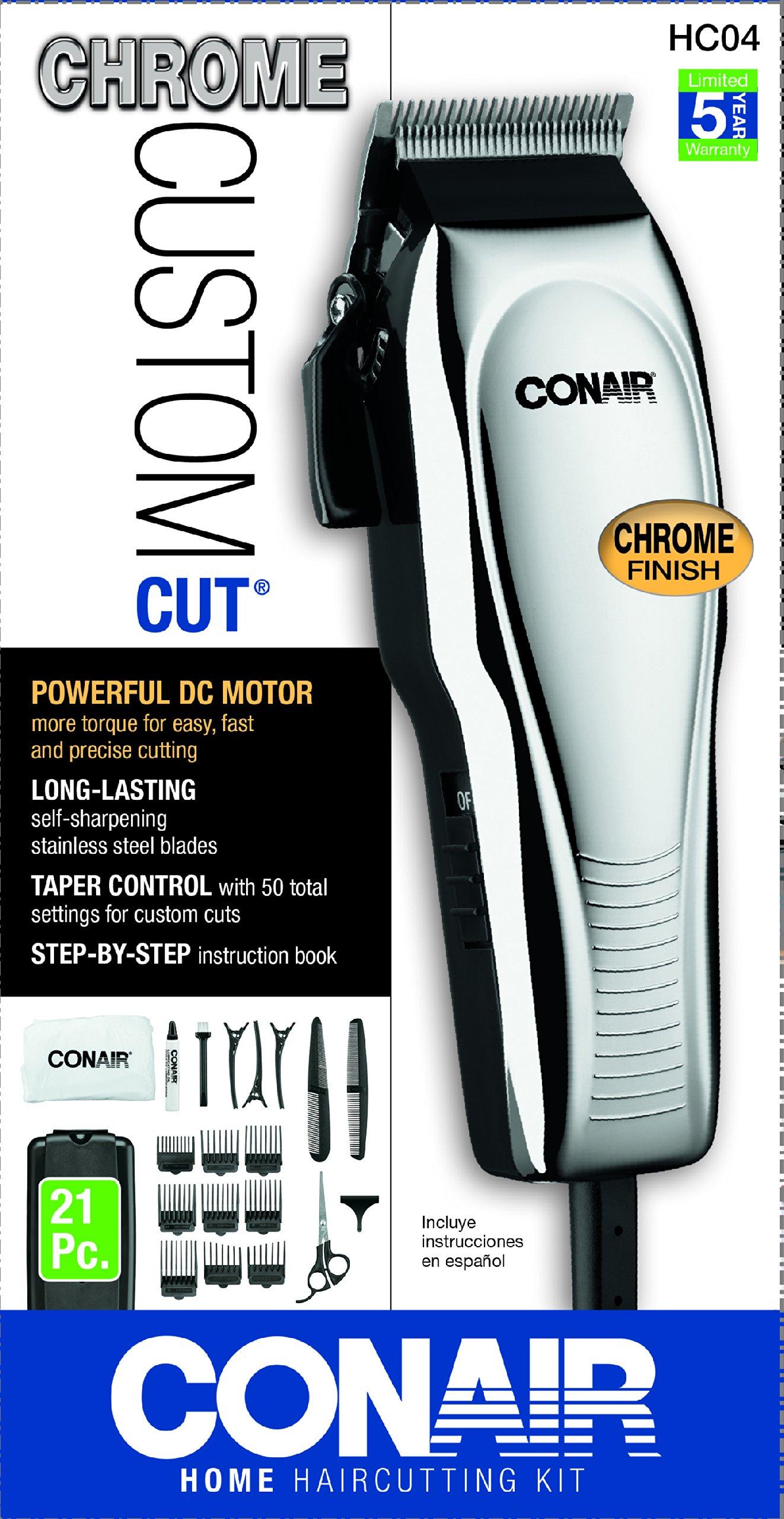 - PROFESSIONAL RESULTS AT HOME: The Conair chrome custom cut 21-piece haircut kit features a corded clipper with 5 position taper control and a powerful DC motor, providing 50 percent more cutting power