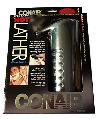 Experience the luxury of a thick, rich hot lather shave with this instant hot lather machine by Conair. It heats shaving cream in about 1 minute, and works with any standard or large size lather refill can without taking up extra counter space. Designed for easy one-hand use, it features a deluxe chrome finish, on indicator and ready indicator lights. Great for legs too. Does not work with shaving gels. Imported. 8Hx4" dia.