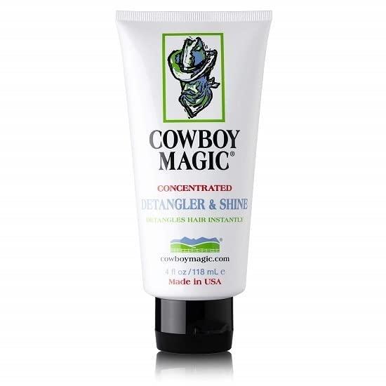 Cowboy Magic detangler & shine Silk proteins moisturize and strengthen your horse's hair, neutralizing static electricity and resulting in a high shine after brushing. Knots and dreadlocks fall out tangle-free right away, No matter how difficult. The non-oily, concentrated formula repels dust, dirt, and sand. Rub in and leave on; this no rinse formula does not require rinsing out. Features: because it does not contain water or alcohol, It won't dry hair No rinse formula has a UV protectant may also be used by humans repels dust, dirt and sand moisturizes and strengthens hair creates high shine after brushing item Specifications: ingredients: cyclomethicone, dimethiconol, C 12-15 alkyl Benzoate, octyl methoxycinnamete, tocopherol acetate, Panthenol, Silk amino acids, methyl-paraben, proplyparaben, and Fragrance.