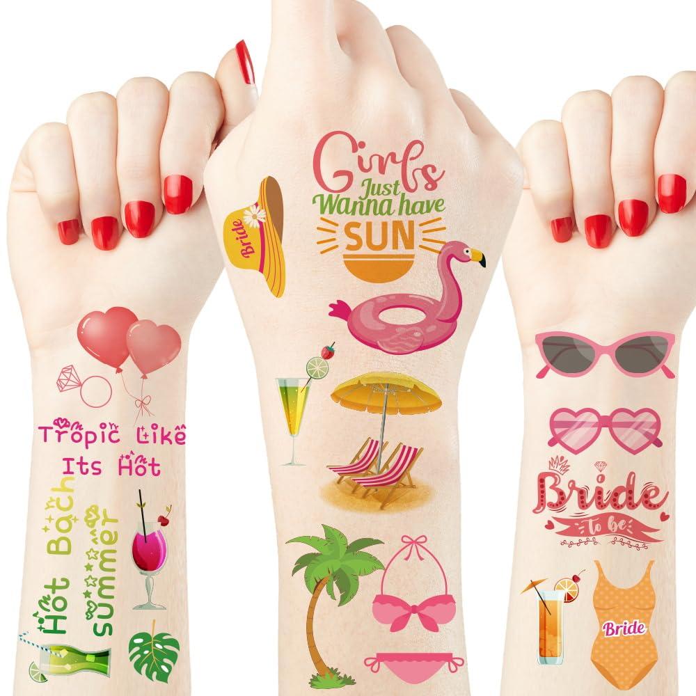 - Unique DesignThese bachelorette summer party temporary tattoos are designed with funny elements, such as palm trees, swimsuits, cocktails,hat ,sunglasses,You can apply these fake tattoos on your face, arms, neck, back and other body parts.